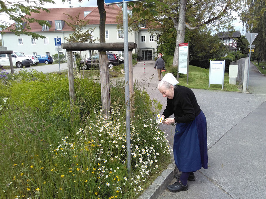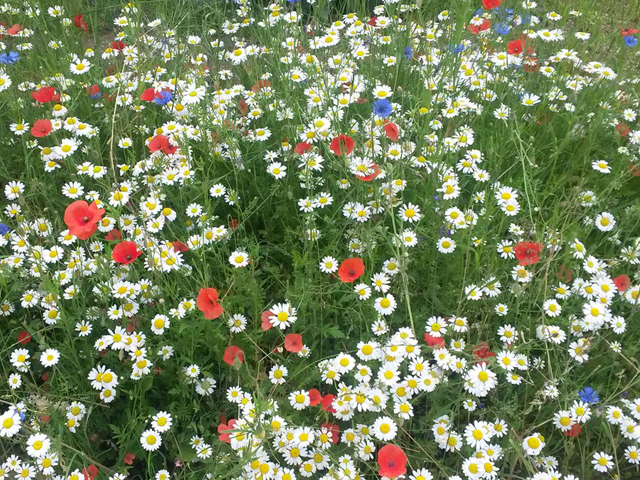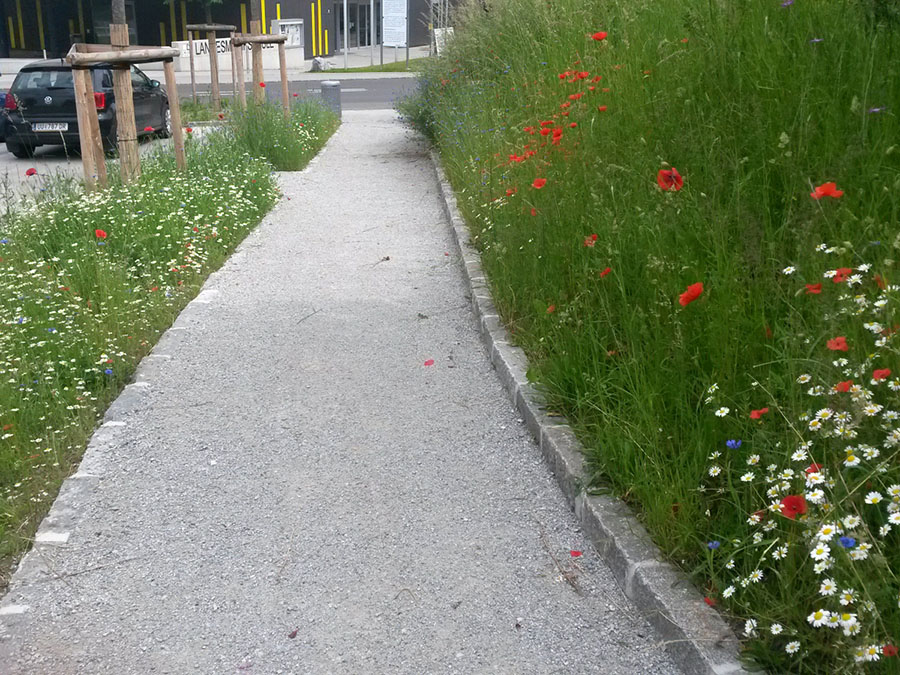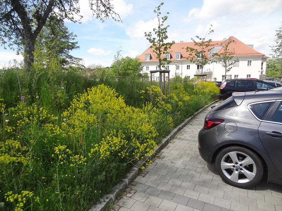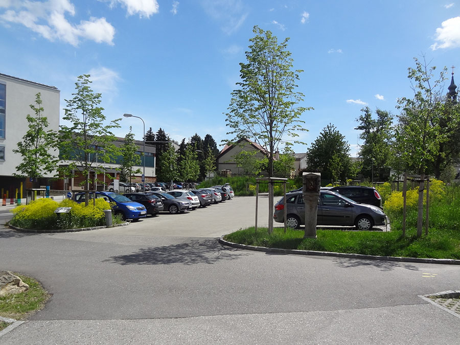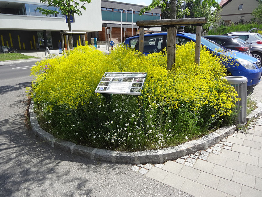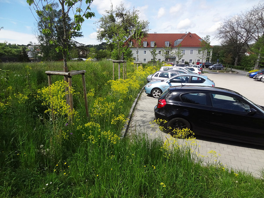 Bei der Errichtung eines neuen Parkplatzes am Rande des Ortszentrums kamen für die Begrünung der Begleitflächen ausschließlich heimische Pflanzen zum Einsatz. Großkronige Laubbäume wie Spitzahorn, Linde und Vogelkirsche als Schattenspender haben durch den Einsatz eines sickerfähigen Betonpflasters langfristig beste Voraussetzungen für ein gutes Gedeihen. Darunter wurden artenreiche REWISA-zertifizierte Saatgutmischungen angesät, die im ersten Jahr einen bunten Feldblumenaspekt boten, bevor in den Folgejahren die eigentlichen Wiesenblumen zur Blüte kamen.