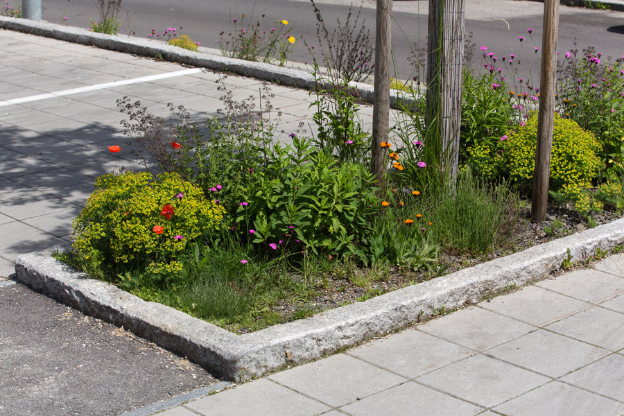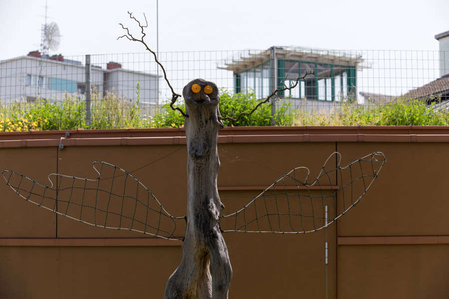 Passend zum Leitthema dieses Marktstandortes "Klimaschutz" wurden die Außenanlagen nach den Prinzipien der Nachhaltigkeit im Sinne der Förderaktion Naturschutz in Gewerbe und Industrie gestaltet: Dachbegrünung, Blumenwiese, Böschungshecken mit Untersaaten von ein- und zweijährigen Wildblumen, Wildkräuterpflanzungen in magerem Granitsand und einheimische Bäume. Ein nachhaltiges Pflegekonzept sorgt für einen ökologischen Mehrwert im Sinne der Biodiversität, der Energie- und CO2-Einsparung sowie des Wasserrückhalts. Die Totholzskulptur Hexapoda all inclusive des Bildhauers Hermann Eckerstorfer ist gleichzeitig Wächter und Wahrzeichen dieser Naturoase und Brutmöglichkeit für die von den Pflanzen angezogenen Insekten.