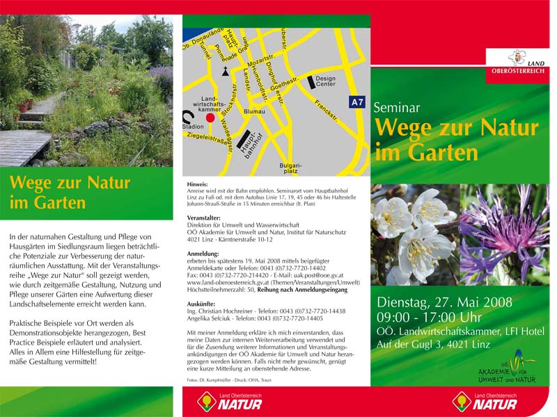 In der naturnahen Gestaltung und Pflege der Freiräume im Siedlungsraum liegen beträchtliche Potenziale zur Verbesserung der naturräumlichen Ausstattung unserer Städte und Dörfer. Mit dem Pilotprojekt „Wege zur Natur im Siedlungsraum“ im Auftrag der Naturschutzabteilung OÖ wurde nachgewiesen, dass ein bewusstes Herangehen an die Gestaltung und Pflege von Freiräumen bei nahezu allen Gestaltungsaufgaben sich signifikant von den konventionellen planerischen und gärtnerischen Vorgangsweisen unterscheidet. Gleichzeitig zeigte sich, dass bei entsprechender didaktischer Aufbereitung die Akzeptanz für naturnahe Gestaltungen bei den Bauherren wesentlich höher ist als gemeinhin angenommen wird.