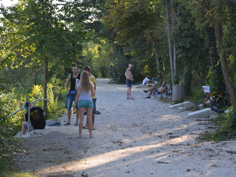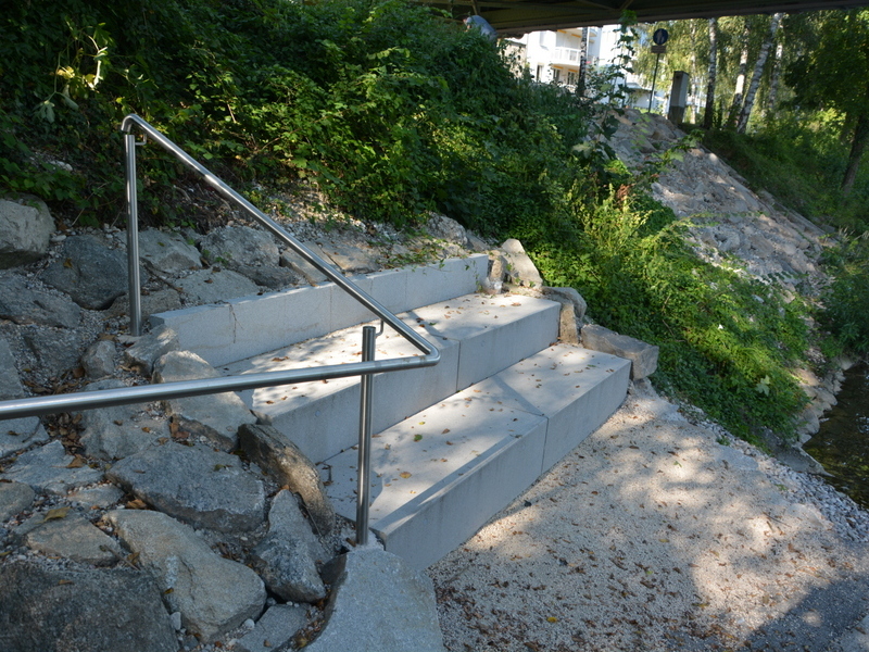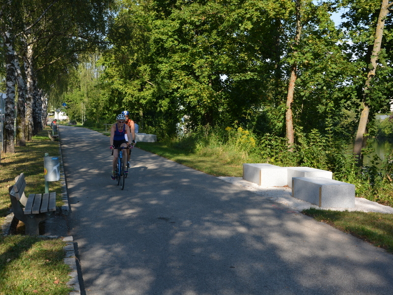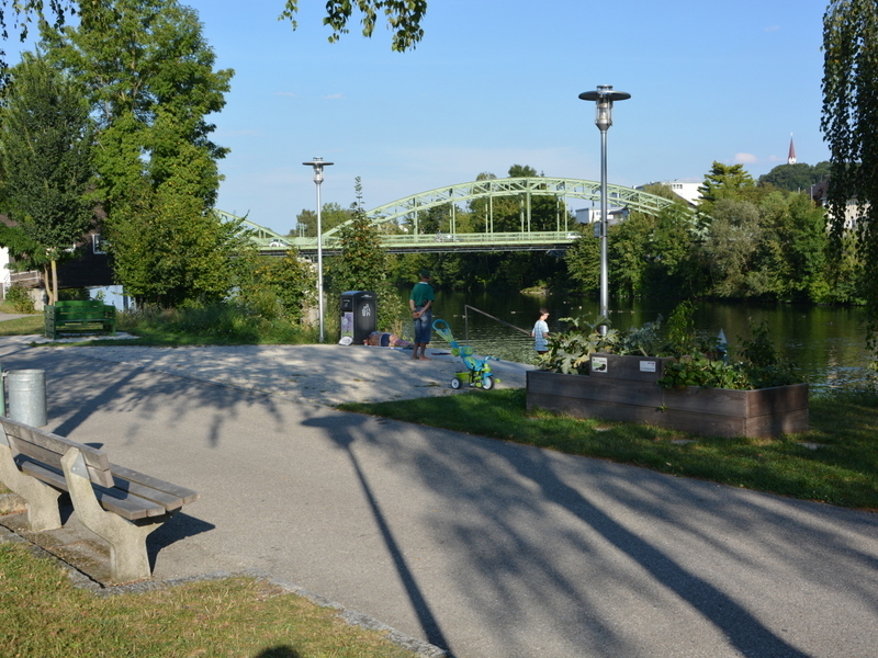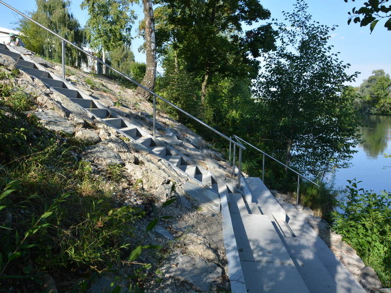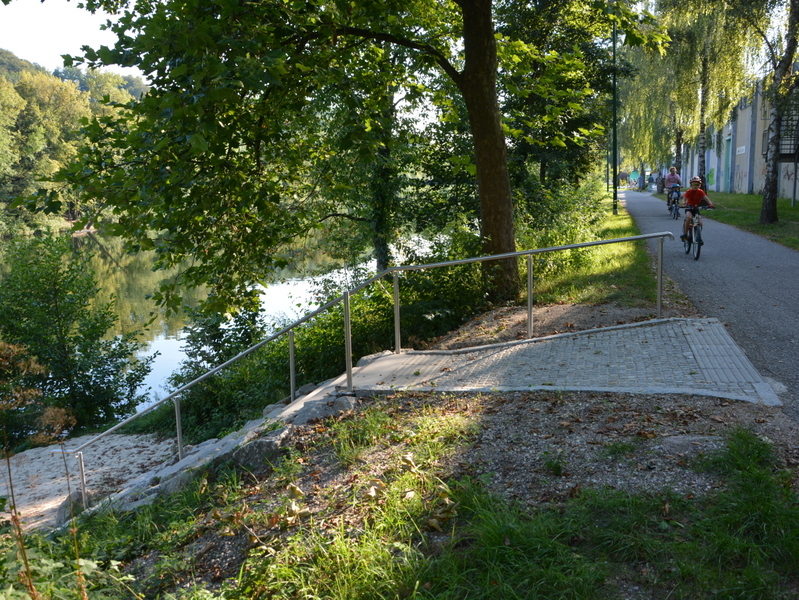 Bis vor kurzem war der Geh- und Radweg zwischen dem Messegelände und der Traun zwar eine wertvolle autofreie Verbindung, die daran vorbeifließende Traun war aber kaum wahrnehmbar und schon gar nicht zugänglich. Durch eine Reihe von Maßnahmen wurden Abgänge zur Traun und Aufenthaltsbereiche am Wasser geschaffen. Der Gehölzbestand wurde aufgelockert und Blickbeziehungen geschaffen. Für Gehbehinderte und Rollstuhlfahrer wurde eine Betriebszufahrt zur komfortablen Rampe umgebaut.