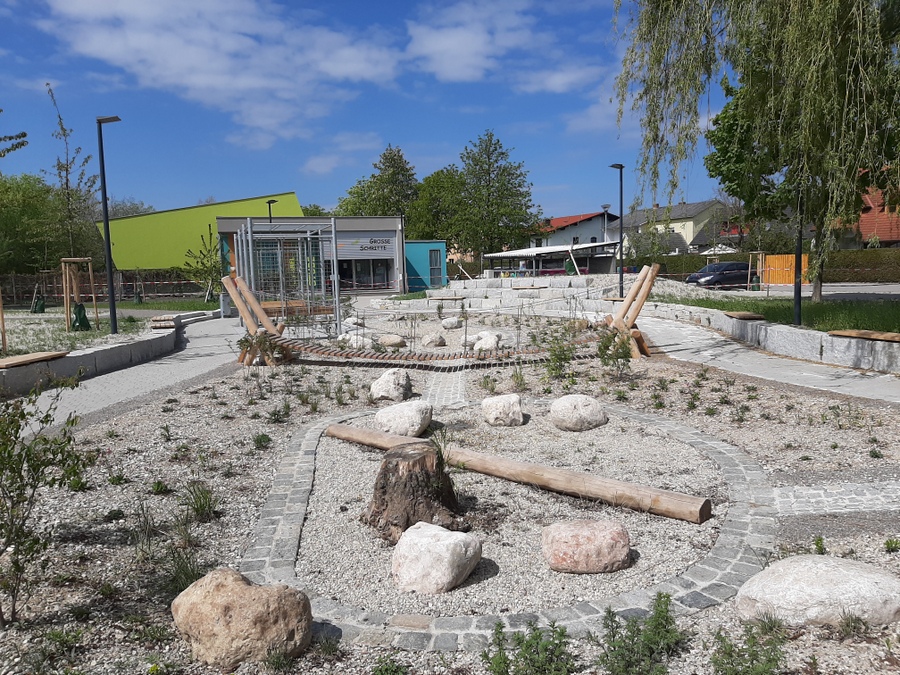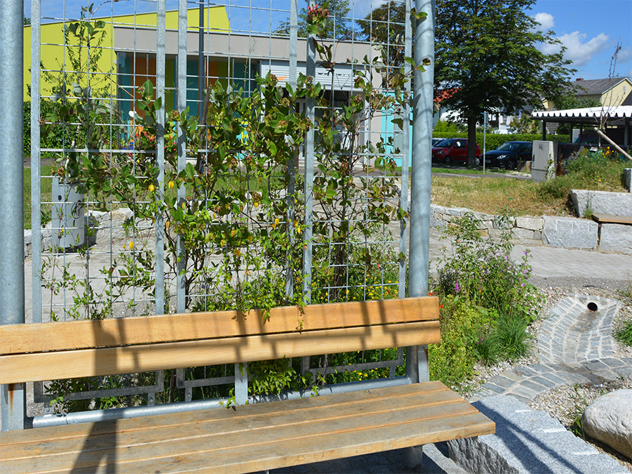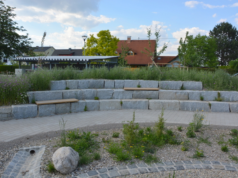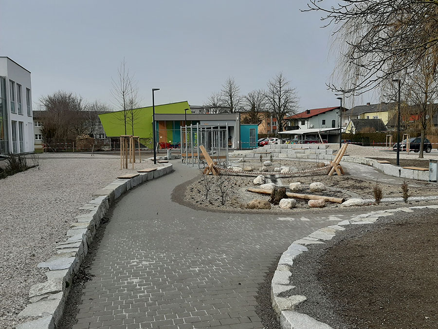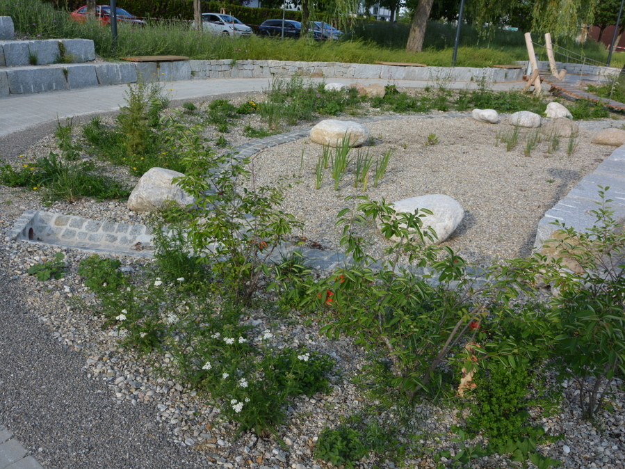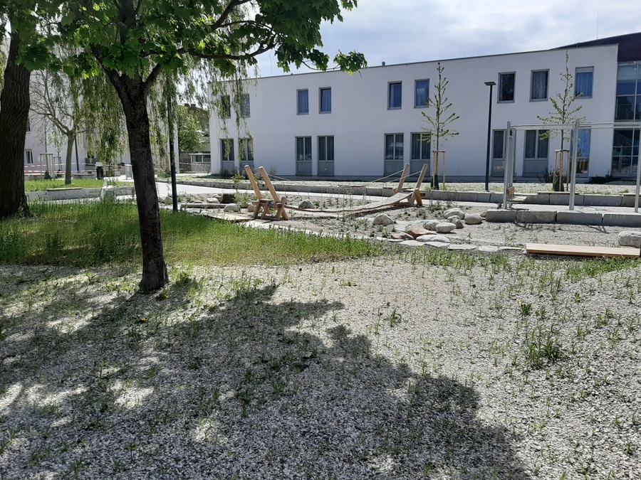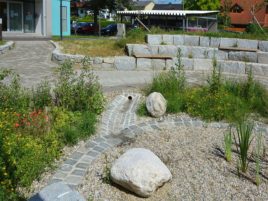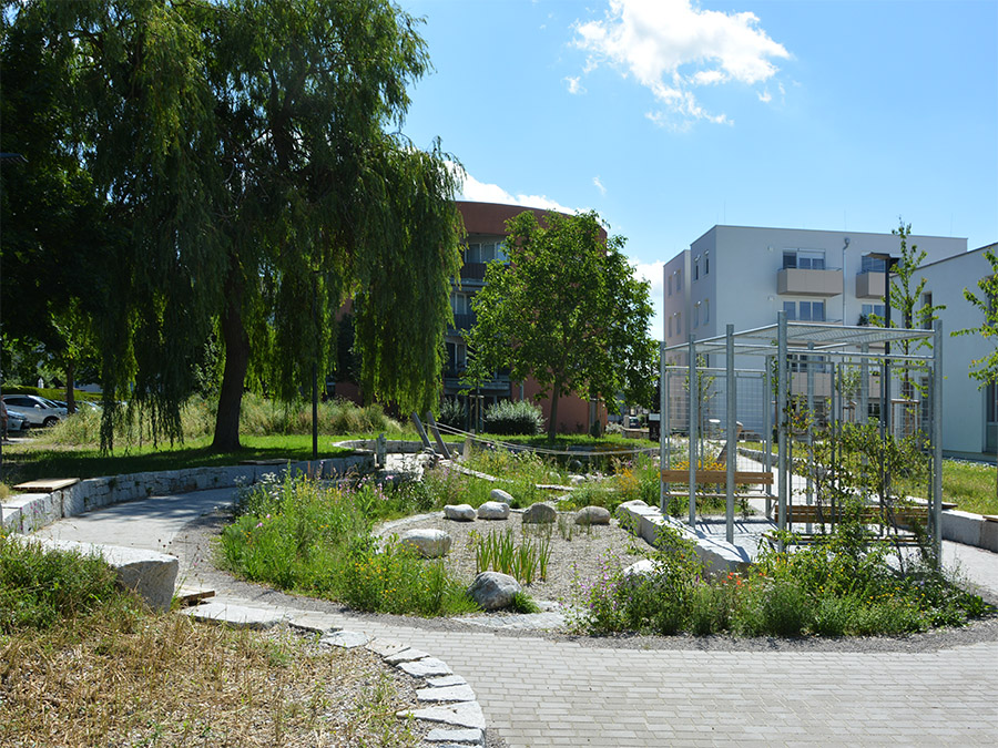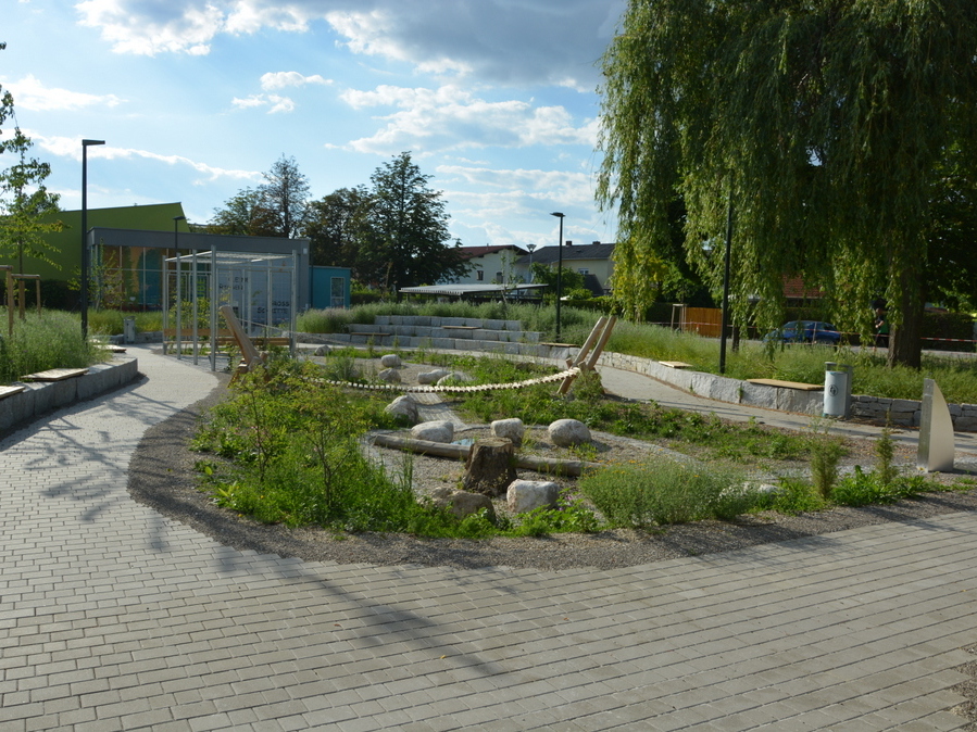 Drei Bäume wurden während der Bauzeit sorgfältig gehütet – eine Trauerweide, ein Ahorn und ein Nußbaum. Zahlreiche Bäume und Sträucher wurden neu gepflanzt, damit der Garten in den zu erwartenden heißen Sommern der kommenden Jahrzehnte zu einer Oase der Erholung in der Mitte von Asten wird. In zwei mit Kies aufgefüllten, reich bepflanzten Sumpfbiotopen wird das Regenwasser gesammelt, in Hitzeperioden verdunstet es und befeuchtet und kühlt es die Luft – eine große natürliche Klimaanlage, die ganz ohne Strom funktioniert.