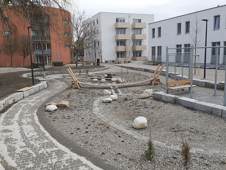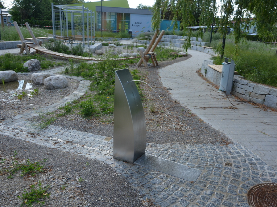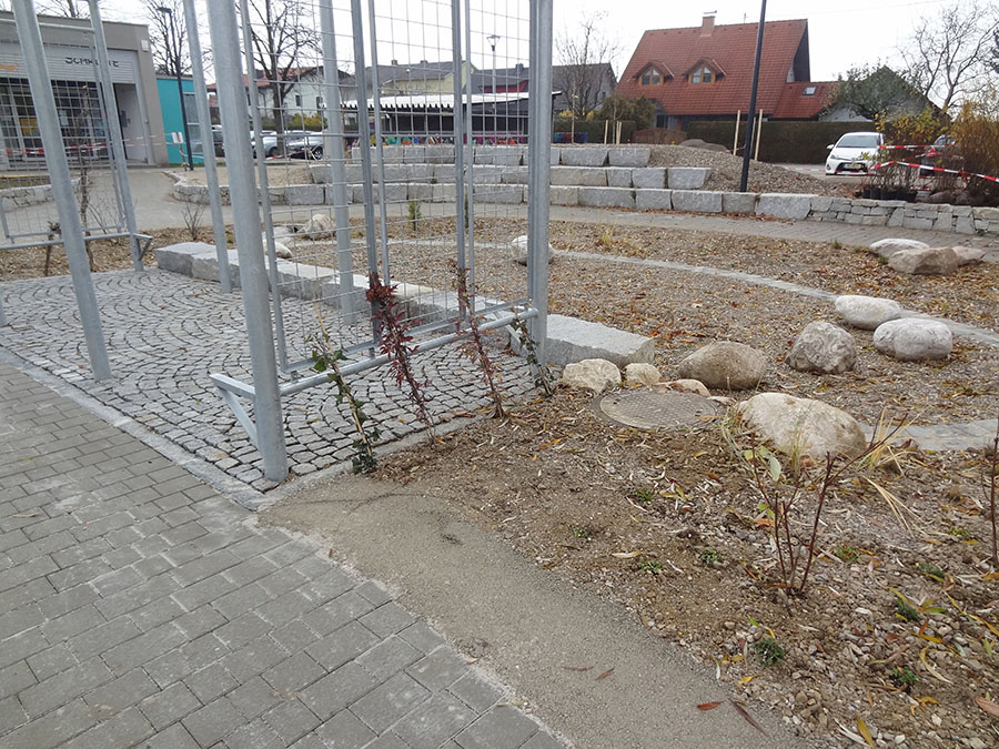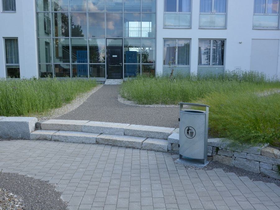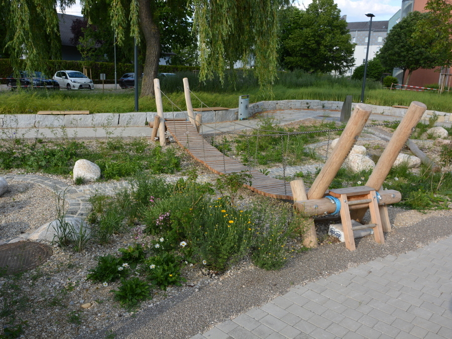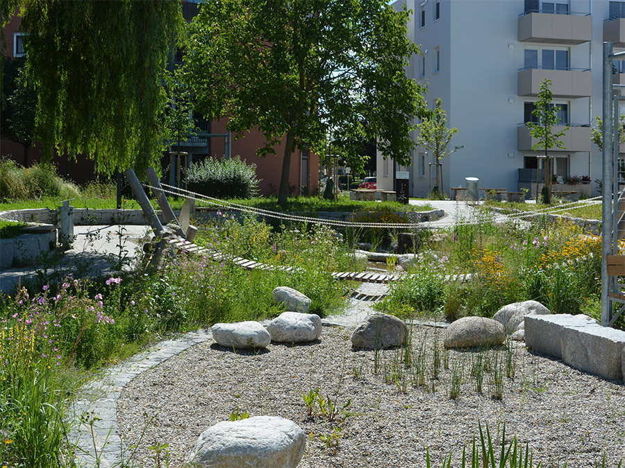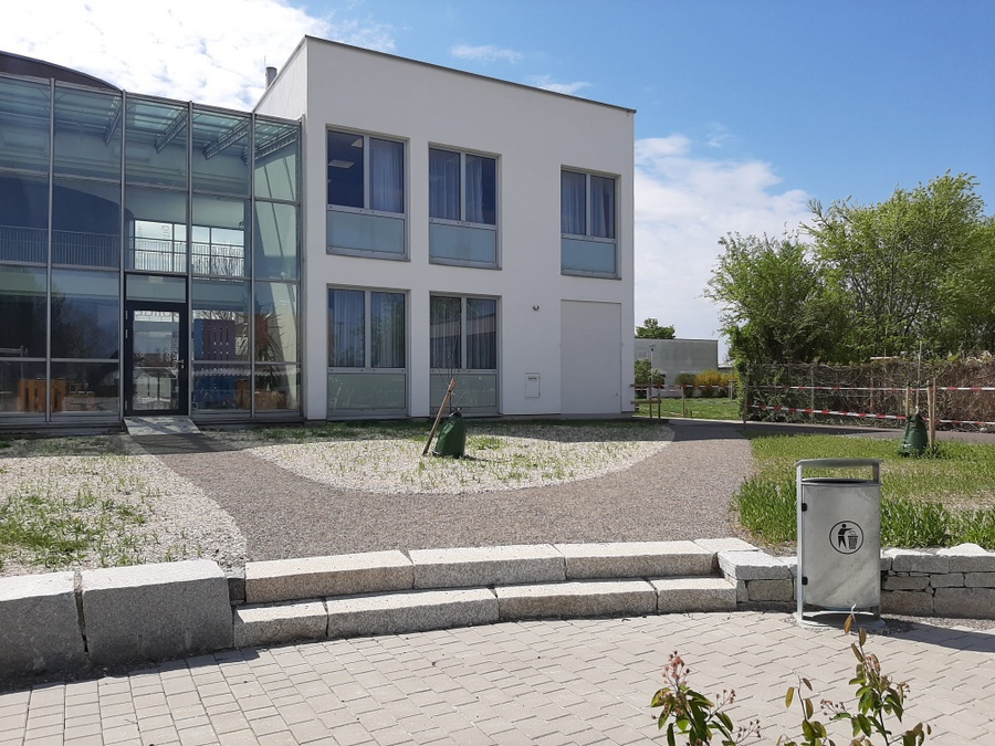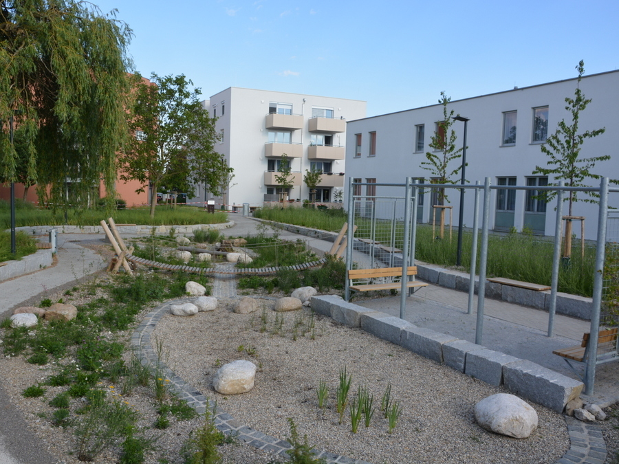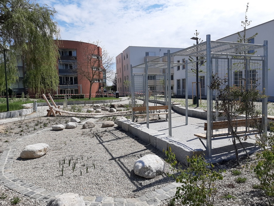Drei Bäume wurden während der Bauzeit sorgfältig gehütet – eine Trauerweide, ein Ahorn und ein Nußbaum. Zahlreiche Bäume und Sträucher wurden neu gepflanzt, damit der Garten in den zu erwartenden heißen Sommern der kommenden Jahrzehnte zu einer Oase der Erholung in der Mitte von Asten wird. In zwei mit Kies aufgefüllten, reich bepflanzten Sumpfbiotopen wird das Regenwasser gesammelt, in Hitzeperioden verdunstet es und befeuchtet und kühlt es die Luft – eine große natürliche Klimaanlage, die ganz ohne Strom funktioniert.