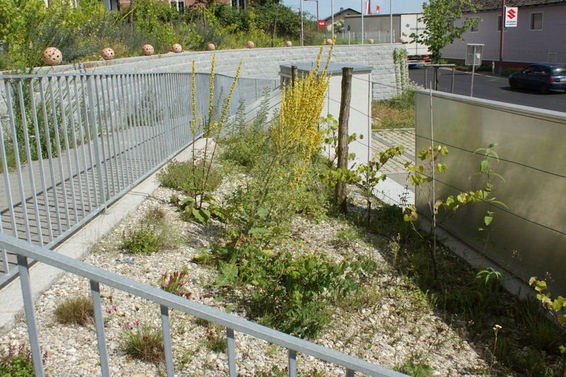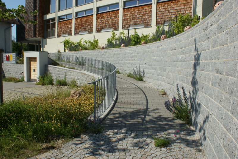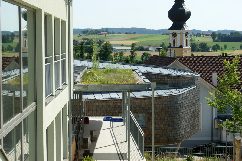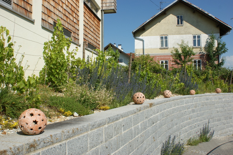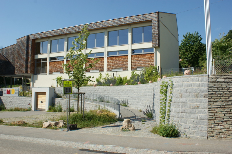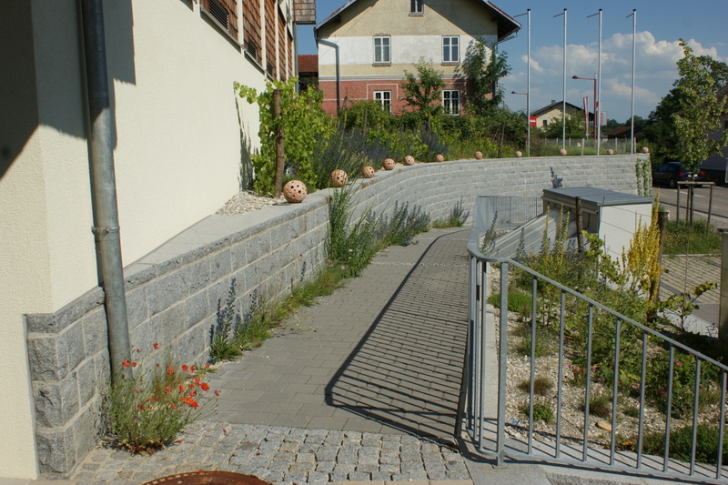 Im Zuge der Renovierung und Umgestaltung von Volksschule, Kindergarten und Musikproberaum wurden die Freiflächen nach den Grundsätzen des Programms "Wege zur Natur im Siedlungsraum" geplant. Vorplatz und Parkplatz wurden mit regionalen Materialien, heimischen Wildpflanzen und sickerfähigen Wegebelägen gestaltet. Eine Besonderheit sind die Poller, für die Findlinge aus den sogenannten "Mehrnbacher Vierzgern" zum Einsatz kamen - ein in dieser Region vorkommendes extrem hartes, eisenoxidfarbenes Quarzkonglomerat, das in den umliegenden Äckern in Form bizarrer Findlinge immer wieder zutage tritt. Das Projekt wurde im Rahmen des Ideenwettbewerbs 2009 der Gemeindeentwicklung Oberösterreich ausgezeichnet.