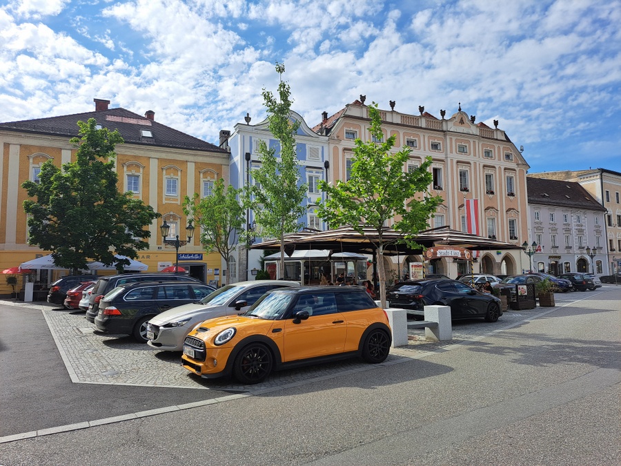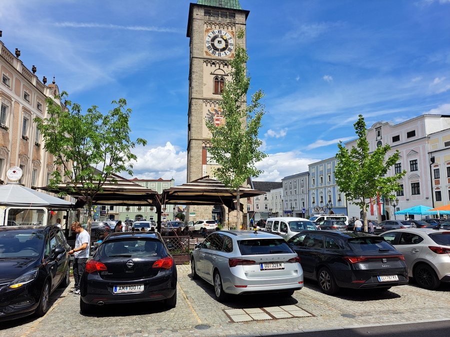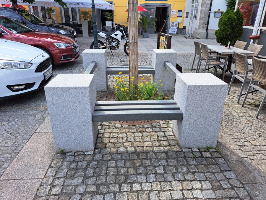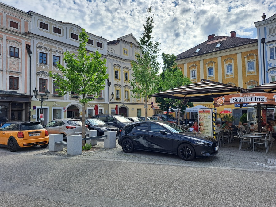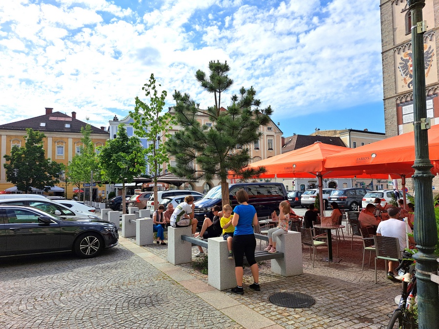 In den 1970er Jahren wurde der Ennser Hauptplatz aufwändig gestaltet - mit kreativen Pflasterungen aus teurem Granit, die allerdings dem damaligen Zeitgeist entsprechend in Beton verlegt und mit Mörtel verfugt wurden. Auf dem Nordende des Platzes wurden sogar sieben Bäume gepflanzt, in kleinen Baumscheiben zwischen unzähligen parkenden Autos. In den fünfzig Jahren ihres Bestehens konnten sich die Bäume nie richtig entwickeln, wurden zum Teil mehrmals ausgetauscht. Im Jahre 2019 war die Zeit reif, euns als Landschaftsarchitekten mit der Erstellung eines Konzepts für eine Baumpflanzung zu beauftragen, die für die künftigen Generationen in diesem Teil des Hauptplatzes ein angenehmes Kleinklima schaffen sollte. Unser Konzept sah die vollständige Entsiegelung von zwei Teilflächen mit 30 Meter Länge und zwei Meter Breite vor. In diesen Flächen wurde der teilweise verdichtete Untergrund bis auf eine Tiefe von zwei Metern ausgehoben und durchlässiger Schotter eingebracht. Für eine künftige Regenwasserrückhaltung wurden Dränageschläuche in 1,5 Meter Tiefe verlegt. Sechs verschiedene in Europa heimische Baumarten wurden gepflanzt und mit einer automatisch gesteuerten Tropfbewässerung ausgestattet. Mit Ausnahme der Baumscheiben wurde die gesamte Fläche wieder gepflastert, allerdings in durchlässiger Bauweise in Splitt und mit Sandfugen. Mit massiven Granitquadern und Bankelementen wurden die Bäume bestmöglich vor den allgegenwärtigen und häufig aggressiven Kraftfahrzeugen geschützt.