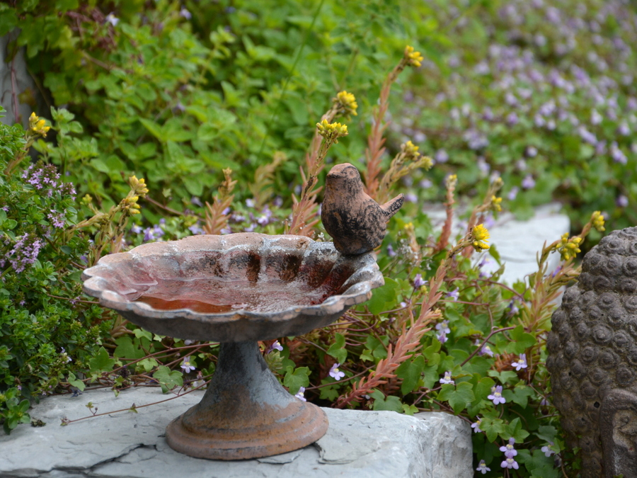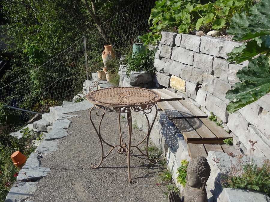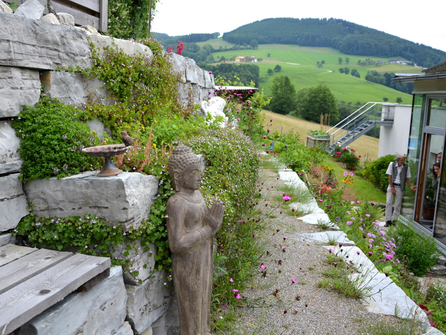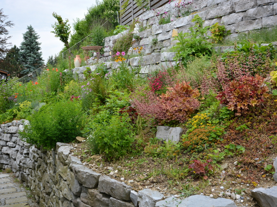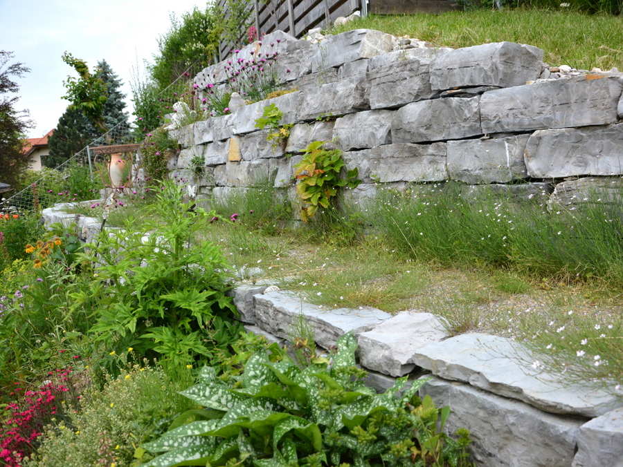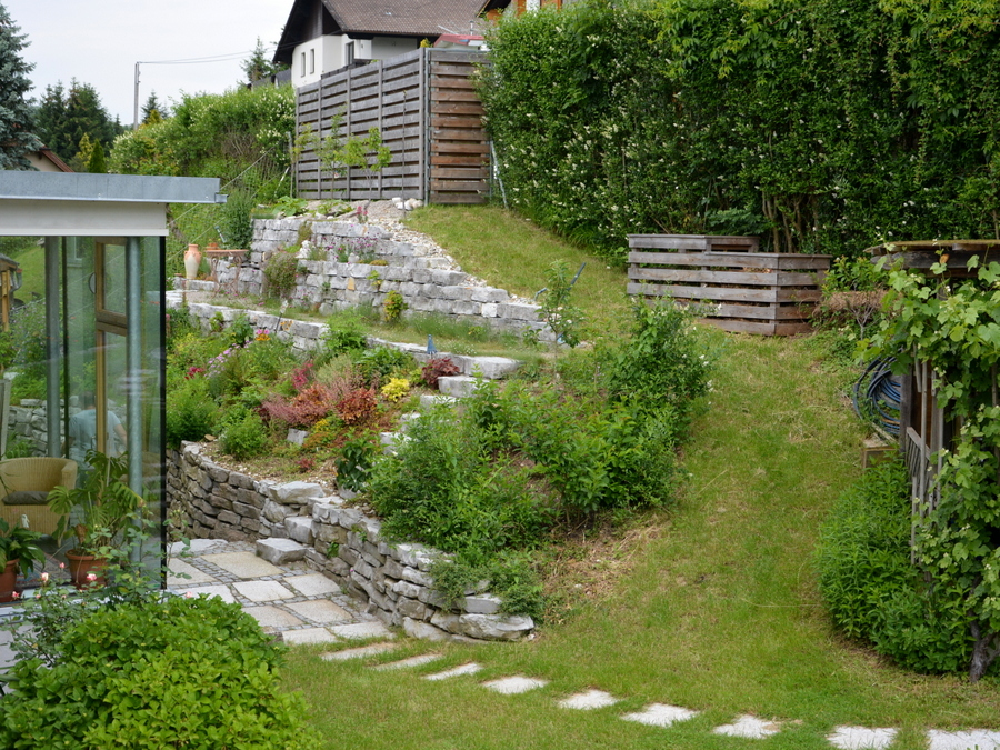 Ein steiler Südhang hinter einem Haus war zugewachsen und verwildert. Er sollte wieder zugänglich gemacht werden und einen kleinen Sitzplatz beinhalten, von dem aus man den weiten Blick ins Tal genießen kann. Um den Hang zu gliedern wurden Trockenmauern aus Kolomaner Schichtkalk gebaut, durch Stufen verbunden und mit einem waagrechten Weg erschlossen, von dem aus auch die Pflege der angrenzenden Blühflächen möglich ist. Besonders schön sind die Abendstimmungen vom Sitzplatz aus zu bewundern, der in die Trockenmauer integriert ist. Liebevoll gestaltete Gartenelemente charakterisieren die Persönlichkeit der Besitzer.