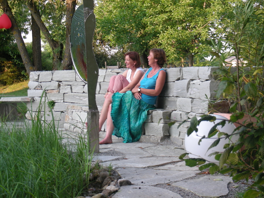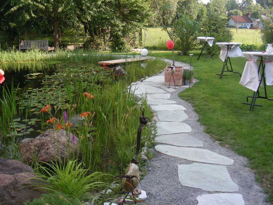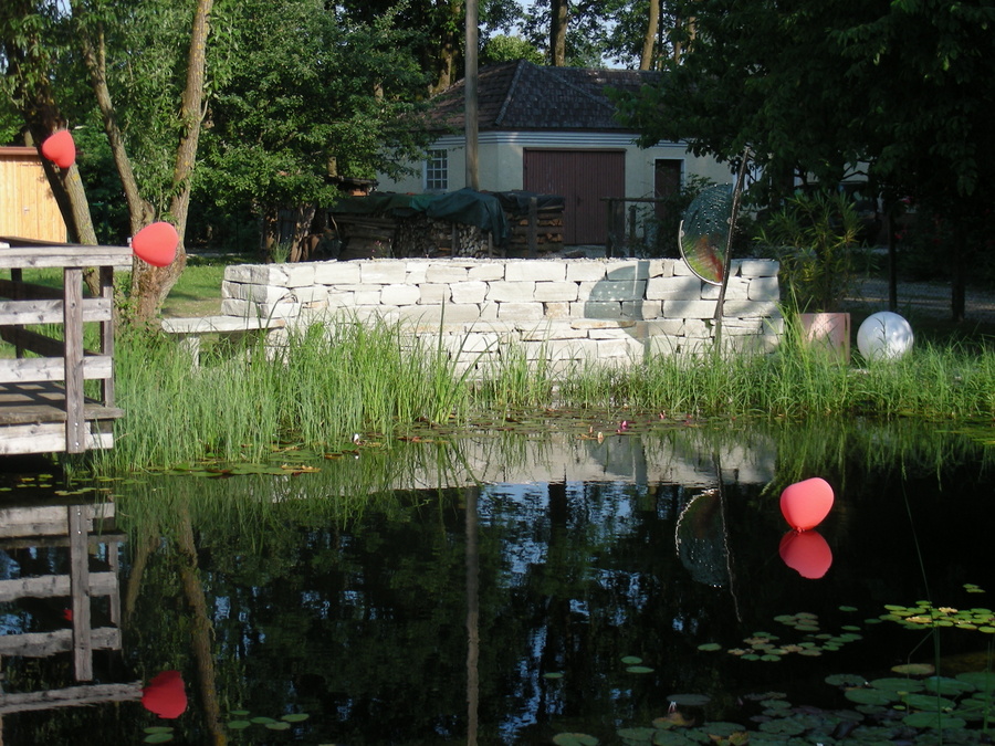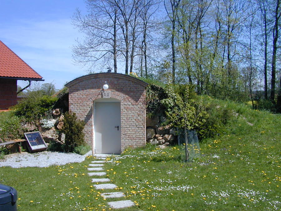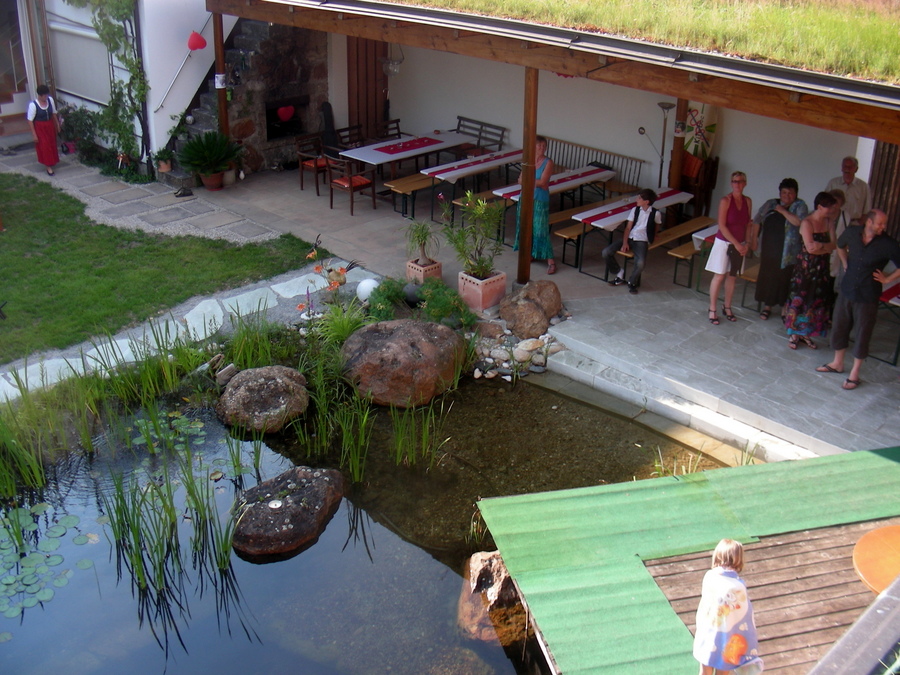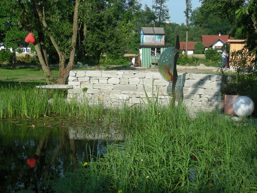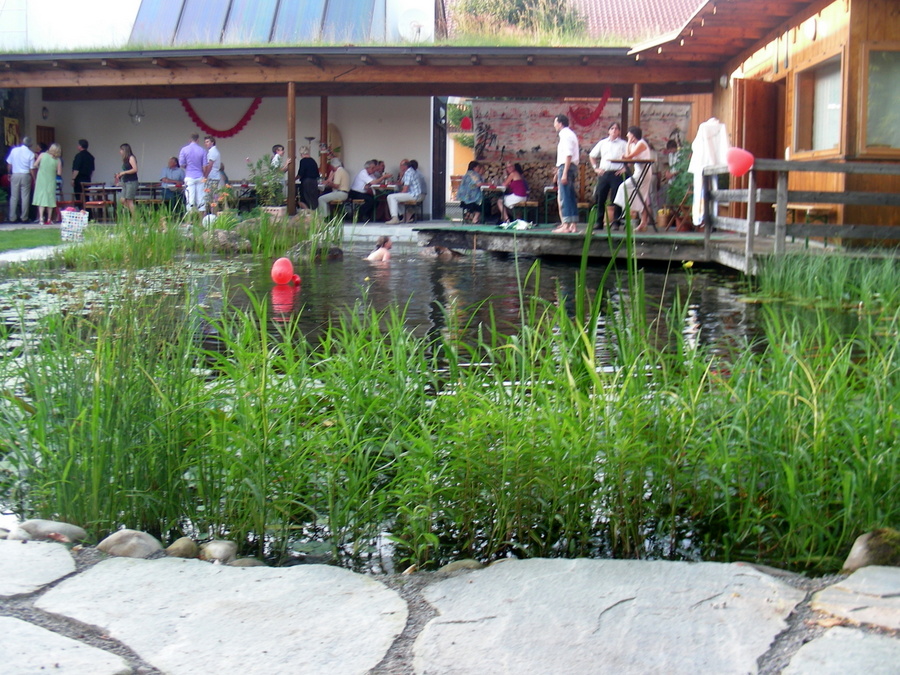 Auf einem 5000 m² großen Bachgrundstück wurde dieser Hausgarten angelegt. Mit einem Schwimmteich, einer großen Ballspielwiese, einem Spielhügel mit integriertem Erdkeller und einem überdachten Sitzplatz mit Gründach wurde dem Kinderreichtum der siebenköpfigen Familie Rechnung getragen. Der Vorgarten ist der Ordination zugewandt und repräsentativ mit parkartigem Charakter gestaltet.
