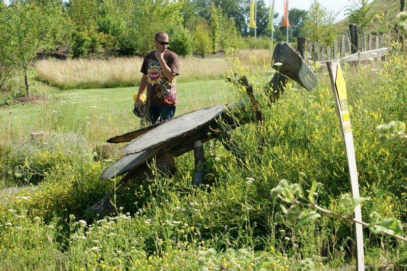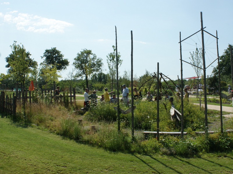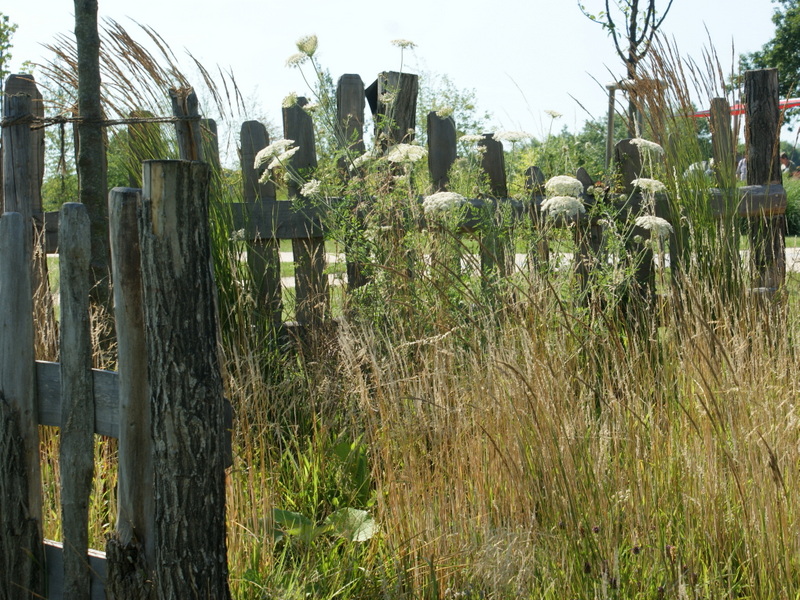 Wesentliche Elemente: Blumeninsel inmitten eines Gräsermeeres, Schotterrasen-Weg, Sitzbänke aus unbesäumten Eichenpfosten, Hüpfstämme, Schwartlingzaun, Sitzplatz mit Polygonalplatten und Trockenmauer aus Granit, Wildholz-Pergola mit Kletterpflanzen. Im Zentrum des Gartens steht "Hexapoda All Inclusive" - das ultimative Insektenhotel.
