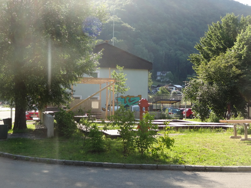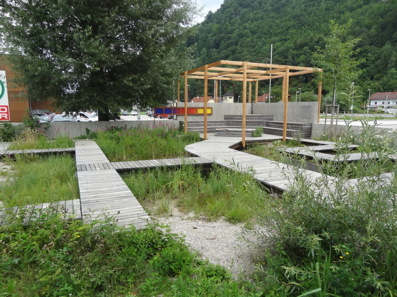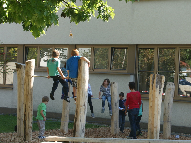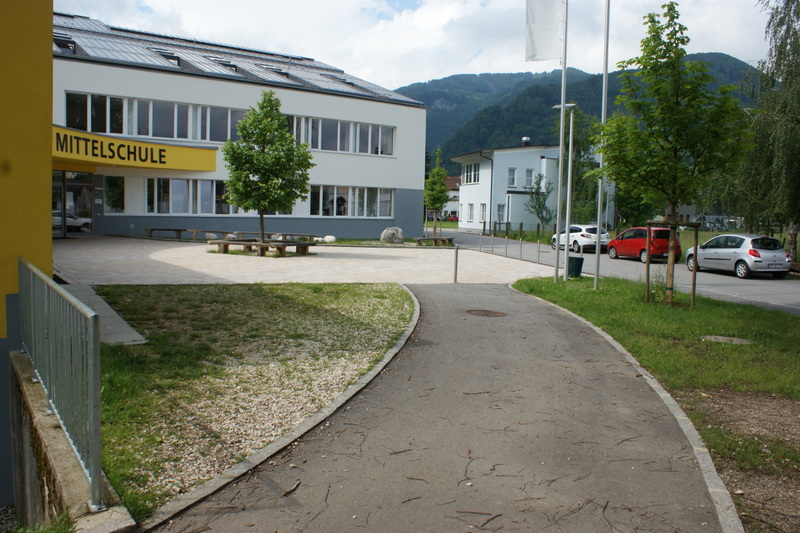 Der weitläufige Schulvorplatz wurde durch eine Sichtbetonmauer mit Schilfstukkatur zur Straße hin abgeschlossen. Ein jahrelang eingezäunter und nicht mehr genutzter Biotopteich aus den 1980er Jahren wurde durch ein Netz von Holzstegen und eine Freiluftklasse benutzbar und erlebbar gemacht. Im Eingangsbereich wurde ein ringförmiger Treffpunkt aus stehend eingegrabenen Eichenstämmen mit Reckstangen in verschiedenen Höhen geschaffen.