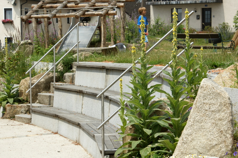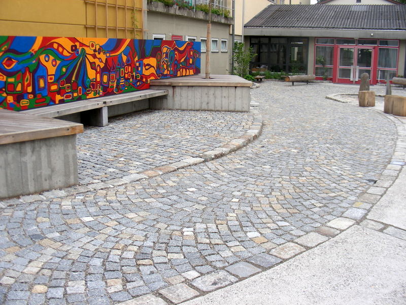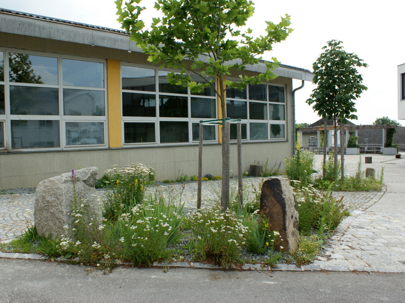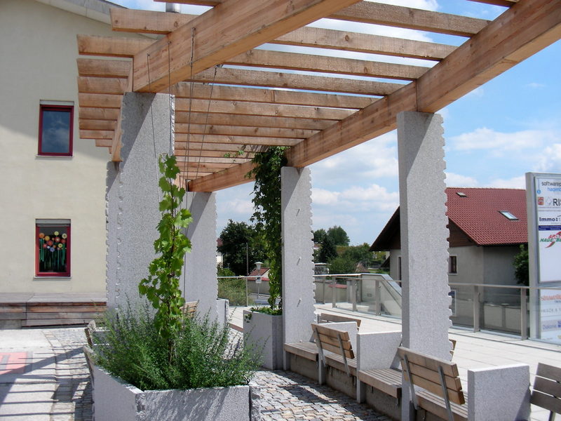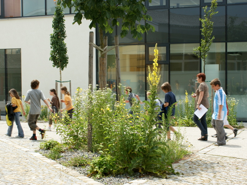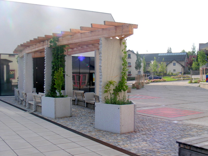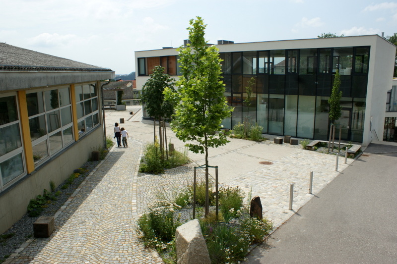 Durch die Errichtung der "Neuen Mitte", eines zentralen Infrastrukturgebäudes ist auf dem Dach einer Parkgarage ein neuer Platz im Zentrum von Hagenberg entstanden. Pausenhof, Treffpunkt, Aufenthaltsort - der neue Platz soll viele Funktionen erfüllen. In einem umfassenden Beteiligungsverfahren wurden die Ansprüche definiert und ein Gestaltungskonzept entwickelt. Regionaltypische Materialien wie Granit und Eichenholz und der Einsatz standortheimischer Pflanzen wurden bevorzugt eingesetzt. Seit Frühling 2008 wird dieser neue Raum von den Kindern der Volksschule intensiv frequentiert.