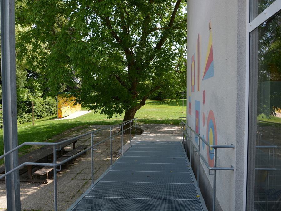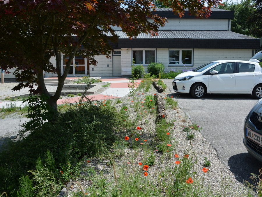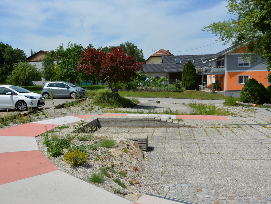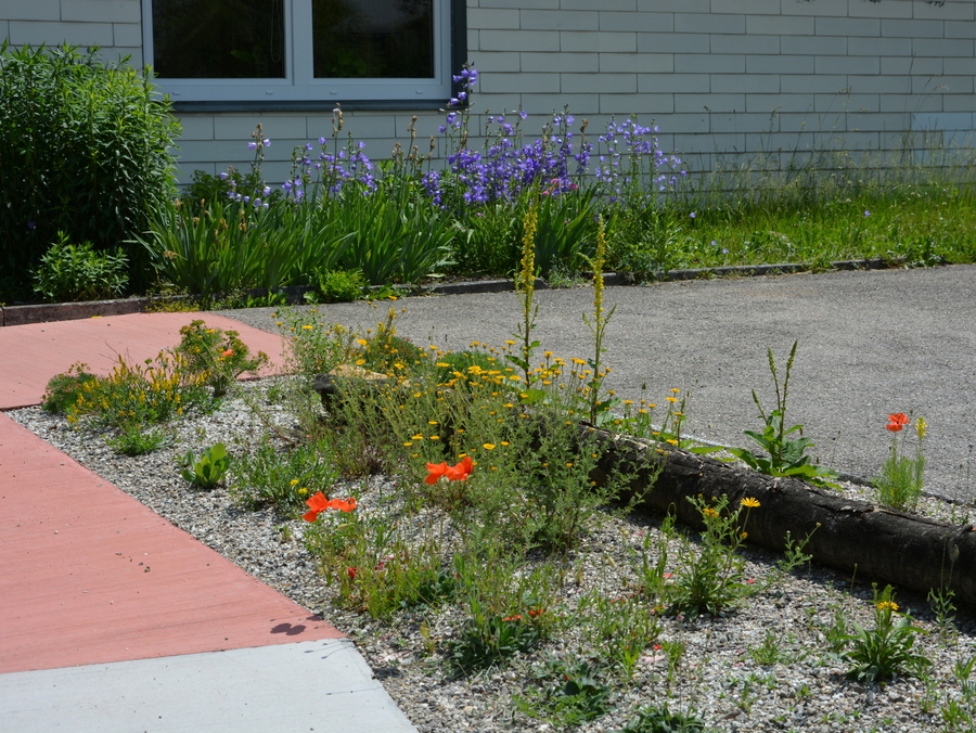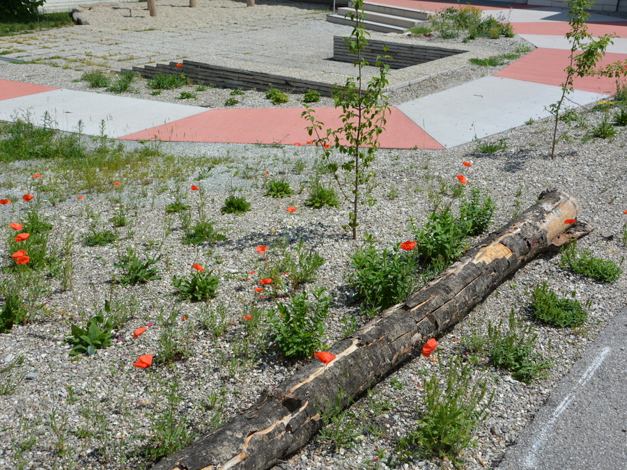 Eine barrierefreie Rampe muss nicht langweilig sein! Hier wurde sie aus farbigen Betonflächen erstellt, die auch zum Spielen einladen. Daneben gibt es Balancierhölzer und ein Reck. Im umgebenden Kies wachsen Wildblumen und einige Wildsträucher, die es vertragen, dass die Kinder gelegentlich durchlaufen. Ihre Farbtupfer ändern sich je nach Jahreszeit und laden auch Bienen und Schmetterlinge zum Verweilen ein.