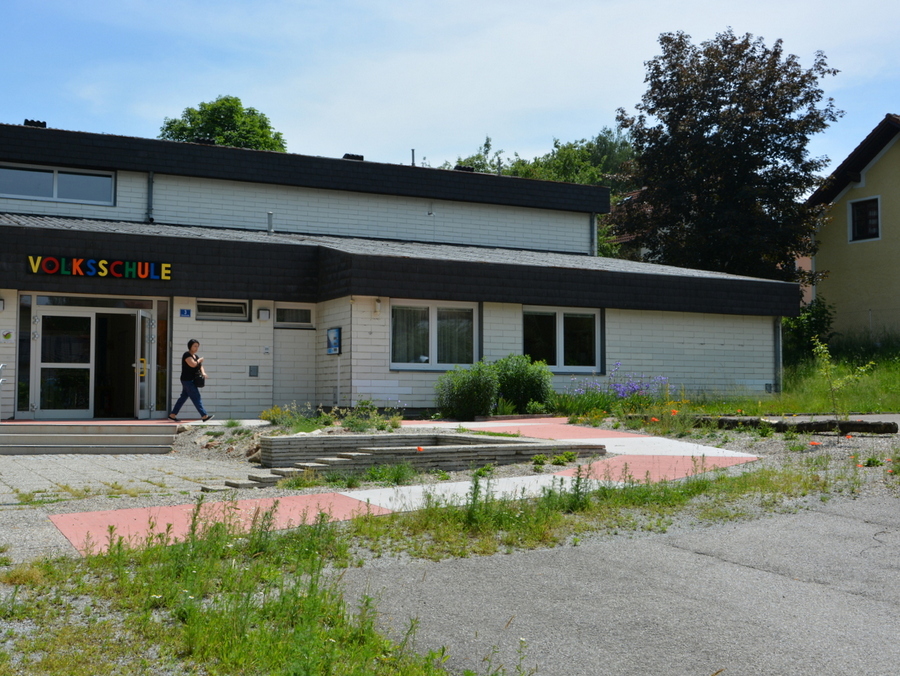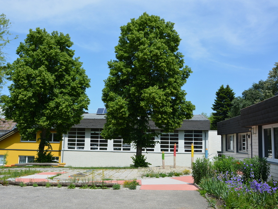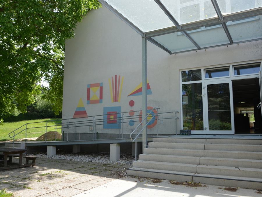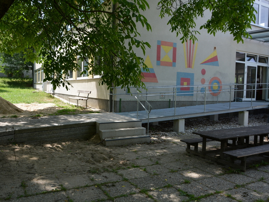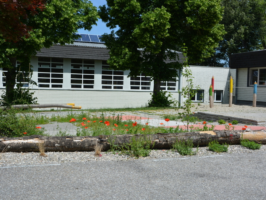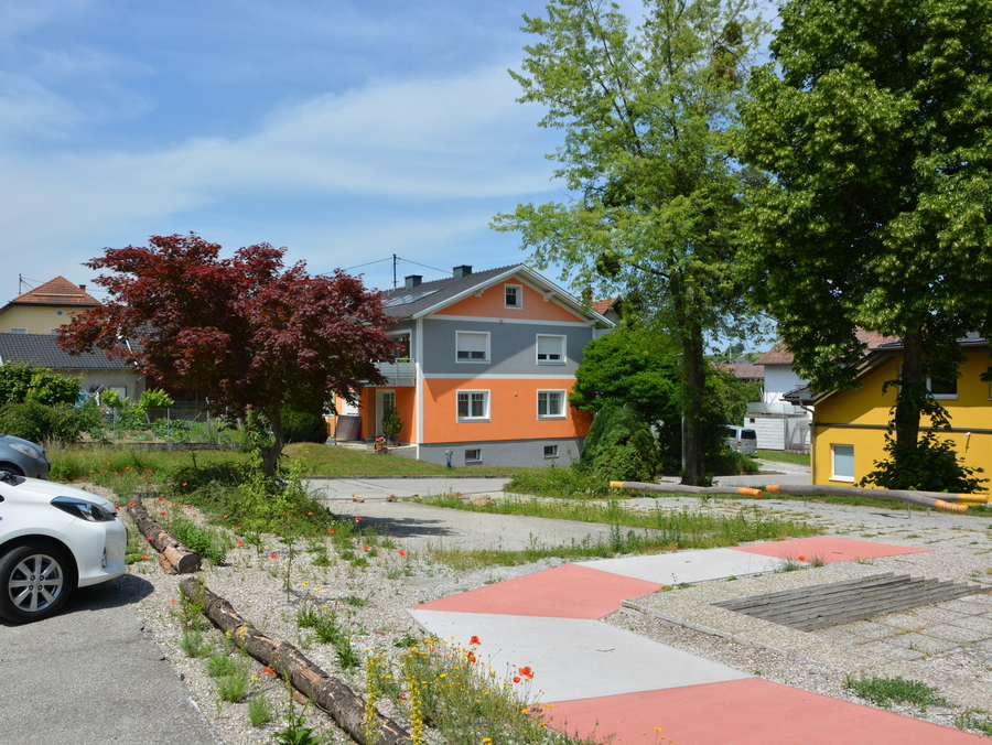Eine barrierefreie Rampe muss nicht langweilig sein! Hier wurde sie aus farbigen Betonflächen erstellt, die auch zum Spielen einladen. Daneben gibt es Balancierhölzer und ein Reck. Im umgebenden Kies wachsen Wildblumen und einige Wildsträucher, die es vertragen, dass die Kinder gelegentlich durchlaufen. Ihre Farbtupfer ändern sich je nach Jahreszeit und laden auch Bienen und Schmetterlinge zum Verweilen ein.