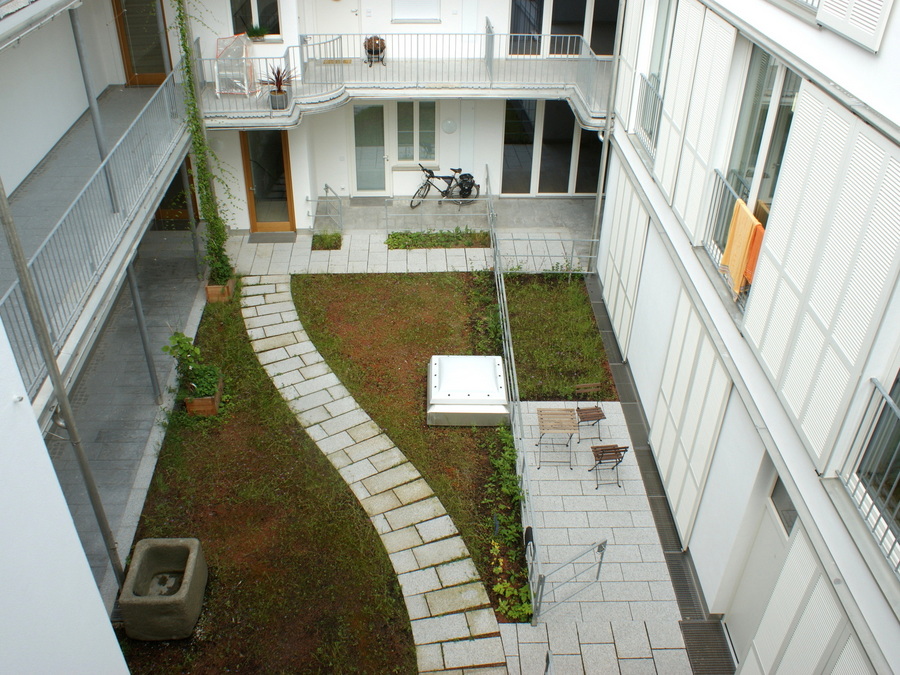 Der Innenhof eines alten Bürgerhauses im Zentrum von Ried wird von vielen umliegenden Wohnungen eingesehen und genutzt. Plattenwege aus Granit erschließen die Grünflächen. Schlingpflanzen an Rankseilen streben aus Pflanztrögen zum Licht und verbinden die drei Geschosse miteinander.